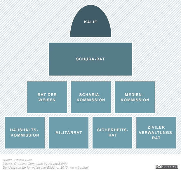 Der sogenannte Kalif ist die entscheidende Leitungsfigur der Organisation mit weitreichenden Kompetenzen und Entscheidungsbefugnissen. Er leitet den Rat an und führt seine verschiedenen Gremien zusammen, die die wichtigsten Glieder im Rahmen der IS darstellen und die Leitung seiner Arbeit in den verschiedenen Handlungsfeldern innehaben. Baghdadi entscheidet somit als derzeitiger "Kalif" in letzter Instanz über die Ernennung und Absetzung der Leiter einzelner Gremien, nachdem er sich den Rat der Schura einholt, der allerdings nicht bindend zu sein scheint.